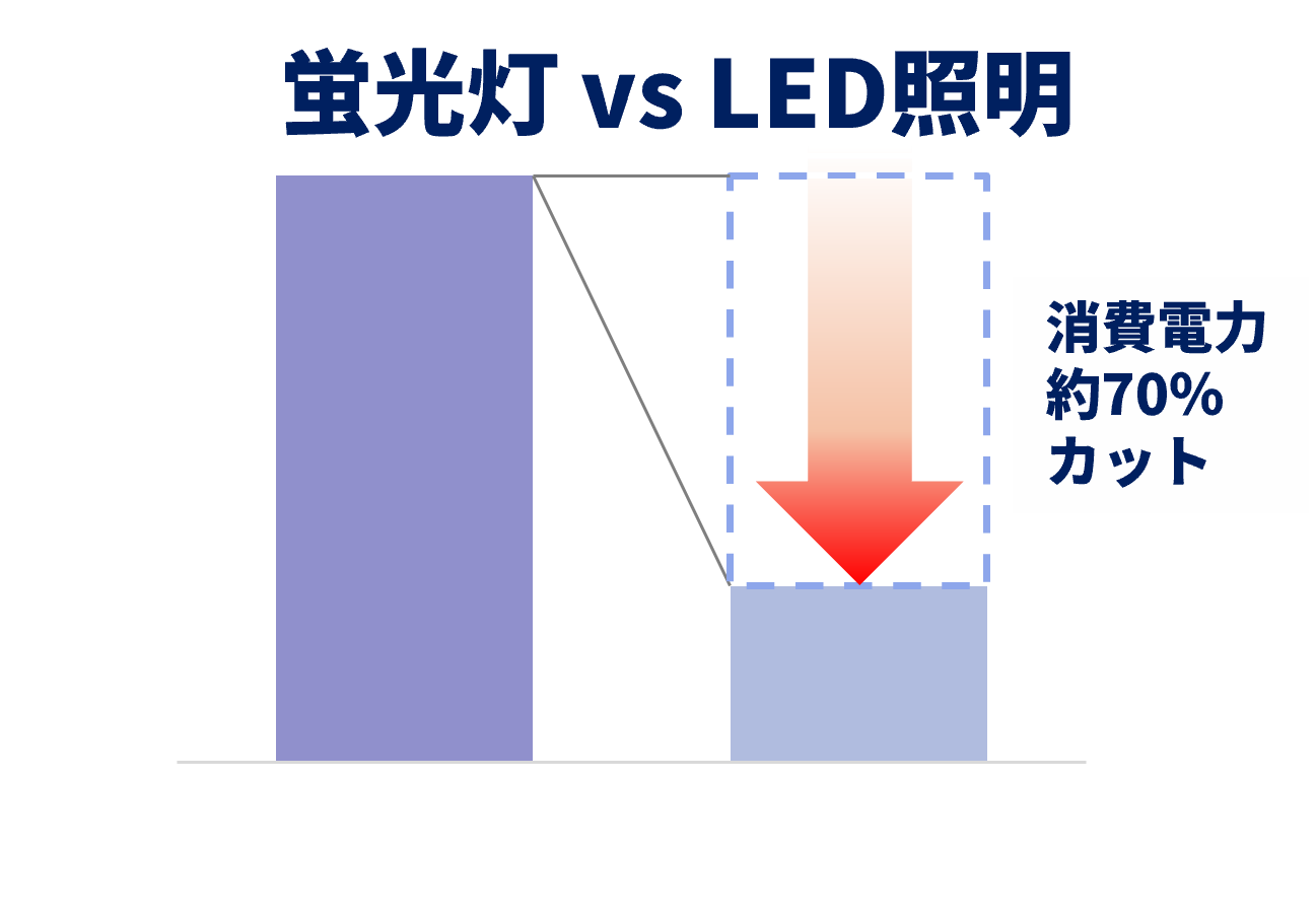 従来の照明に比べ、最大で70%以上の消費電力を削減